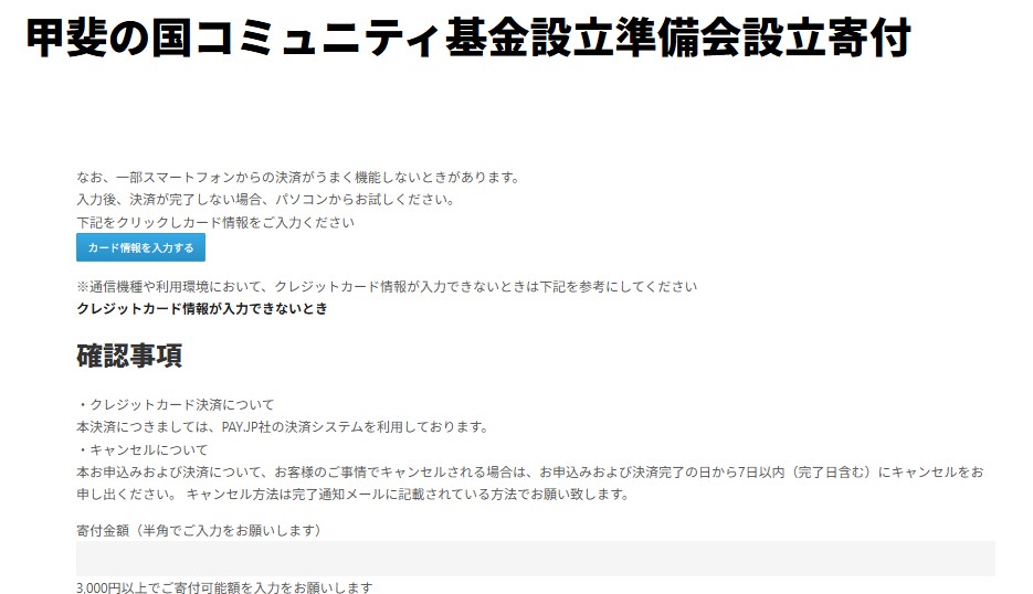 ※注:リンク先のクレジット決済のページ上では「甲斐の国コミュニティ基金設立準備会設立寄付」と表記しています。(上画像参照)