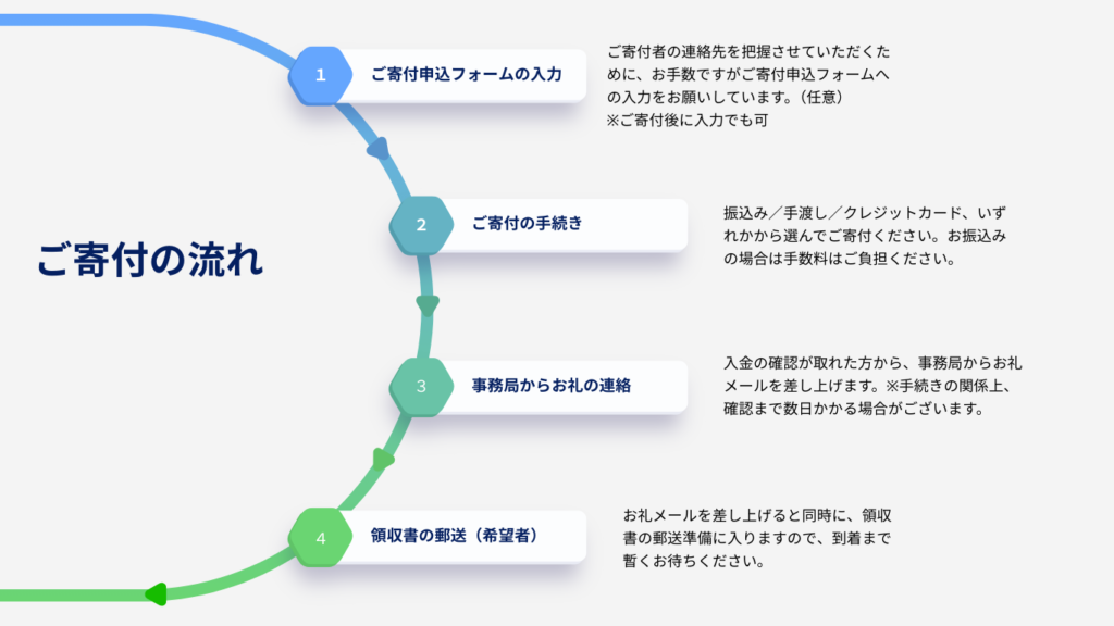 ご寄付方法(銀行振込/手渡し/クレジットカード)や、領収書の発行に必要な情報などを申し込みフォームから入力してください。